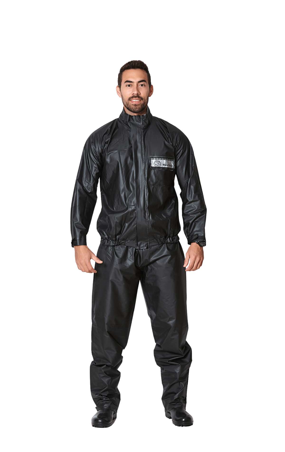 Conjunto de chuva confeccionado em PVC forrado, composto por blusão com fechamento frontal por zíper e velcro, carcela de proteção, elástico na cintura, ajuste nos punhos por velcro, faixa refletiva nas costas e no bolso frontal. Calça com ajuste na cintura por elástico, zíper para ajuste no tornozelo.