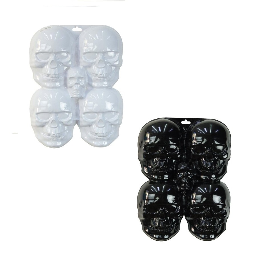 Painel decorativo em formato com 5 crânios de caveiras brancas ou pretas ideal para compor a decoração de seu halloween